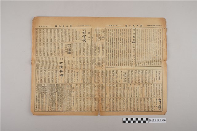 1.本物件為三六九小報社發行《三六九小報》第二百四號,正面為廣告,有太原醫院、永茂商行、逢安理學治療所、關子嶺清秀旅館、石池賣藥類似品製造所、山本齒科醫院等單位;背面寫有雜爼專欄「雅言」、「犬乘」、「阿里山游草」等文章,另有春痕秋夢錄專欄,左下有花叢小記;翻開內頁有「金魁星」、「人世百面觀」、社會小說「社會鏡」、滑稽小說「天師爺」、現代長篇「大陸英雌」等文章。2.《三六九小報》發行時間自昭和5年 (1930)至昭和10年 (1935),旨以刊登戲謔、針砭時事之文,反映當時的社會狀況。