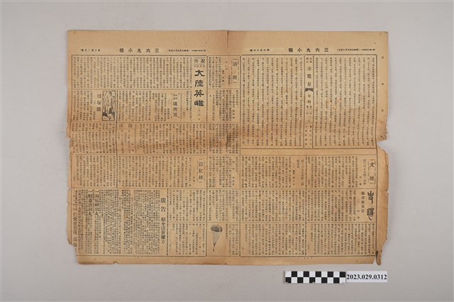 1.本物件為三六九小報社所發行《三六九小報》第二百十六號,發行人為趙雅福,報紙正面刊登太原醫院、永茂商行、逢安治療所、大源株式店、安步靴店等廣告,背面為雜爼專欄、東鱗西爪等文章,翻開內頁則為大陸英雄、金魁星等長篇連載及紅柑等短篇著作,右邊刊有文壇專欄,內頁中間為詩壇專欄左下為廣告欄位。2.《三六九小報》發行時間至昭和5年 (1930)至昭和10年 (1935)。旨以刊登戲謔、針貶時事之文,反映當時的社會狀況。