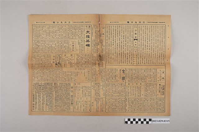 1.本物件為三六九小報社所發行《三六九小報》第二百十九號,發行人為趙雅福,報紙正面刊登太原醫院、永茂商行、逢安治療所、長門屋玩具店、赤崁麵部等廣告,背面為雜爼專欄、雅言專欄、東鱗西爪等文章,翻開內頁則為大陸英雄、恨塚銘、金魁星等長篇連載,右邊刊有文壇專欄,內頁中間為詩壇專欄左下為廣告欄位。2.《三六九小報》發行時間至昭和5年 (1930)至昭和10年 (1935)。旨以刊登戲謔、針貶時事之文,反映當時的社會狀況。