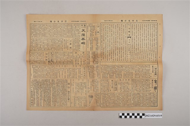 1.本物件為三六九小報社所發行《三六九小報》第二百二十三號,發行人為趙雅福,報紙正面刊登太原醫院、永茂商行、逢安治療所、蘭記書局、長門屋玩具店、赤崁麵部等廣告,背面為雜爼專欄、雅言專欄、春痕秋夢錄、東鱗西爪等文章,翻開內頁則為大陸英雄、恨塚銘、金魁星等長篇連載,右邊刊有開心文苑專欄,內頁中間為詩壇專欄左下為廣告欄位。2.《三六九小報》發行時間至昭和5年 (1930)至昭和10年 (1935)。旨以刊登戲謔、針貶時事之文,反映當時的社會狀況。