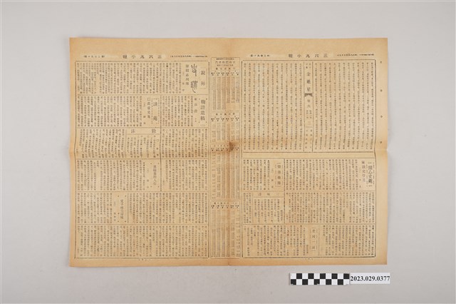 1.本物件為三六九小報社發行《三六九小報》第二百九十號,發行人為趙雅福,正面為廣告頁,有カフヱー明星、永茂商行、湖海英雄傳、蘭記書局、六和商店、南生煌記藥房等廣告;背面雜爼專欄則有「東游日記」、「局紳趣事」等文章;翻開內頁有說海專欄「續志列傳」、「黑暗裏的人生」等文章。2.《三六九小報》發行時間自昭和5年 (1930)至昭和10年 (1935),旨以刊登戲謔、針砭時事之文,反映當時的社會狀況。