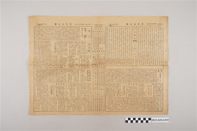 1.本物件為三六九小報社發行《三六九小報》第三百十六號,刊號原本為第三百七十三號但被塗改為第三百十六號,發行人為趙雅福,正面為廣告頁,有合資會社南郡運輸組、長門屋玩具店、永茂商行、和光醫院、鴻文活版舍、永森記商行等廣告;背面雜爼專欄則有「東游日記」、「祝三六九小報更生」等文章;翻開內頁有說海專欄「城隍靈驗」、實情小說「家庭波浪」等文章。2.《三六九小報》發行時間自昭和5年 (1930)至昭和10年 (1935),旨以刊登戲謔、針砭時事之文,反映當時的社會狀況。