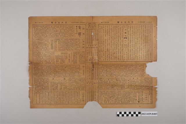 1.本物件為三六九小報社發行《三六九小報》第三百二十號,發行人為趙雅福,正面為廣告頁,有大億商行、建泰商行、捷豐商行、永茂商行、南生公司等廣告;背面雜爼專欄則有「荒唐齋小話」、「笑」等文章;翻開內頁有說海專欄「相術奇驗」、實情小說「家庭波浪」等文章。2.《三六九小報》發行時間自昭和5年(1930)至昭和10年(1935),旨以刊登戲謔、針砭時事之文,反映當時的社會狀況。
