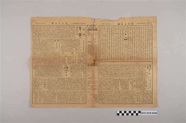 1.本物件為三六九小報社發行《三六九小報》第三百二十三號,發行人為趙雅福,正面為廣告頁,有和光醫院、富士撞球俱樂部、永森記商行、建泰商行、長門屋玩具店等廣告;背面雜爼專欄則有「靜室小言」、「著名動物誌」等文章;翻開內頁有說海專欄「相術奇驗」、「男人和女人那個美麗」等文章。2.《三六九小報》發行時間自昭和5年(1930)至昭和10年(1935),旨以刊登戲謔、針砭時事之文,反映當時的社會狀況。