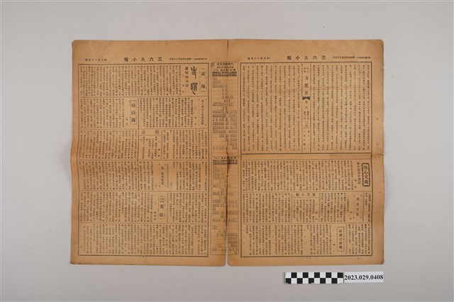 1.本物件為三六九小報社發行《三六九小報》第三百二十五號,發行人為趙雅福,正面為廣告頁,有建泰商行、長門屋玩具店、萬生商會、六和商店、太原商店等廣告;背面雜爼專欄則有「靜室小言」、「著名動物誌」等文章;翻開內頁有說海專欄「相術奇驗」、「男人和女人那個美麗」等文章。2.《三六九小報》發行時間自昭和5年(1930)至昭和10年(1935),旨以刊登戲謔、針砭時事之文,反映當時的社會狀況。