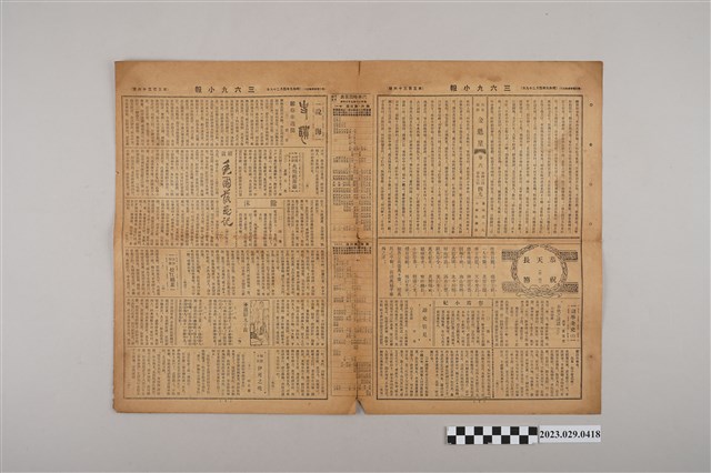 1.本物件為三六九小報社發行《三六九小報》第三百三十六號,發行人為趙雅福,正面為廣告頁,有和光醫院、永森記商行、臺灣會計檢查所、建泰商行、王外科醫院等廣告;背面雜爼專欄則有「實若虛」、「綠波山房摭談」等文章;翻開內頁有說海專欄「蔡牽逸聞」、滑稽小說「火燒桃源鎮」等文章。2.《三六九小報》發行時間自昭和5年(1930)至昭和10年(1935),旨以刊登戲謔、針砭時事之文,反映當時的社會狀況。