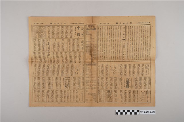 1.本物件為三六九小報社發行《三六九小報》第三百三十九期,發行人為趙雅福,本報正面為廣告頁,有永森記商行、永茂商行、和光醫院、臺灣會計檢查所等商家廣告;背面有「正誤」、雜爼專欄「雜色話」等文章;翻開內頁有短篇小說「浪愛」,紀實短篇「戇生」等文章。2.《三六九小報》發行時間自昭和5年(1930)至昭和10年(1935),旨以刊登戲謔、針砭時事之文,反映當時的社會狀況。