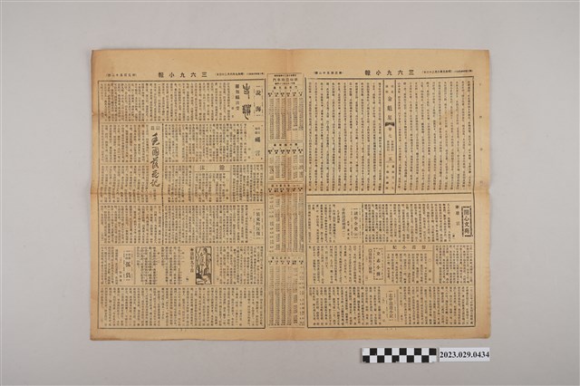 1.本物件為三六九小報社發行《三六九小報》第三百五十二期,發行人為趙雅福,本報正面為廣告頁,有六和百貨店、永茂商行、蘭記圖書部、應元製藥公司等商家廣告;背面有雜爼專欄「劍廬隨筆」、「新聲律啓蒙」等文章;翻開內頁有「裝束的反復」,短篇小說「孤負」等文章。2.《三六九小報》發行時間自昭和5年(1930)至昭和10年(1935),旨以刊登戲謔、針砭時事之文,反映當時的社會狀況。