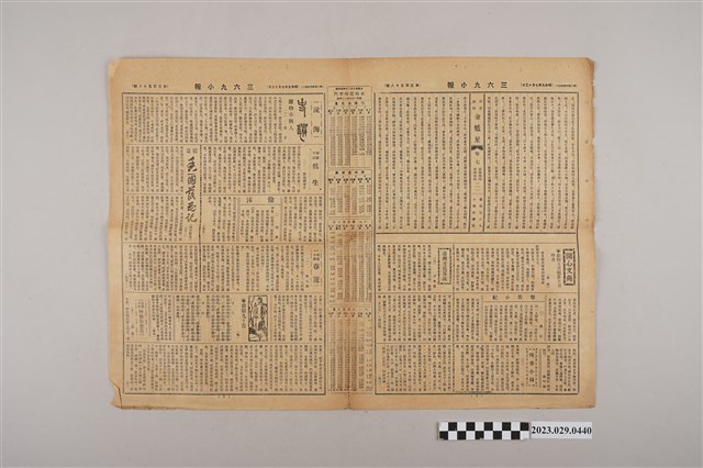 1.本物件為三六九小報社發行《三六九小報》第三百五十八期,發行人為趙雅福,本報正面為廣告頁,有六和百貨店、永茂商行、蘭記圖書部等商家廣告;背面有雜爼專欄「雜色話」、「新聲律啓蒙」等文章;翻開內頁有短篇小說「春遊」、「偽生」等文章。2.《三六九小報》發行時間自昭和5年(1930)至昭和10年(1935),旨以刊登戲謔、針砭時事之文,反映當時的社會狀況。