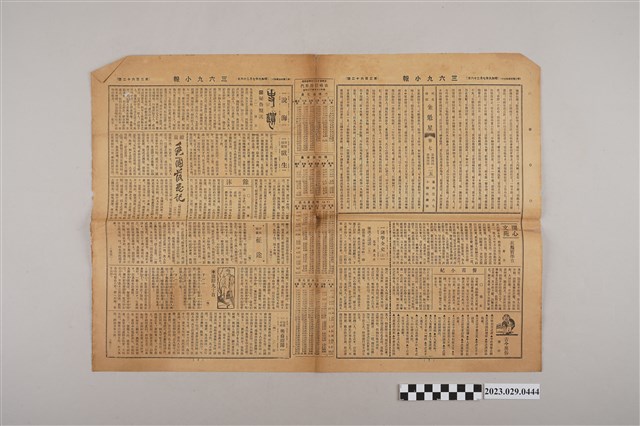 1.本物件為三六九小報社發行《三六九小報》第三百六十二期,發行人為趙雅福,本報正面為廣告頁,有六和洋品店、永茂商行、崇文堂書店等商家廣告;背面有雜爼專欄「臺灣文化畧說」、「新聲律啓蒙」等文章;翻開內頁有短篇小說「明裔瑣聞」,滑稽短篇「獃生」等文章。2.《三六九小報》發行時間自昭和5年(1930)至昭和10年(1935),旨以刊登戲謔、針砭時事之文,反映當時的社會狀況。