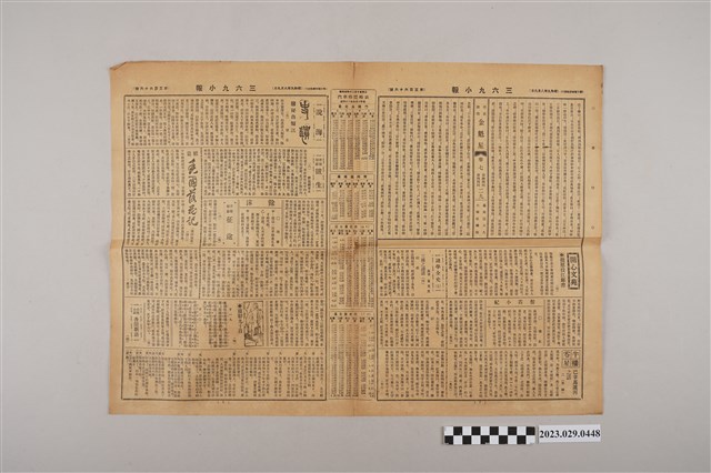 1.本物件為三六九小報社發行《三六九小報》第三百六十六期,發行人為趙雅福,本報正面為廣告頁,有應元製藥公司、蘭計圖書部、崇文堂書店等商家廣告;背面有雜爼專欄「靜室小言」、「新聲律啓蒙」等文章;翻開內頁有滑稽小說「香閨新語」,滑稽短篇「獃生」等文章。2.《三六九小報》發行時間自昭和5年(1930)至昭和10年(1935),旨以刊登戲謔、針砭時事之文,反映當時的社會狀況。