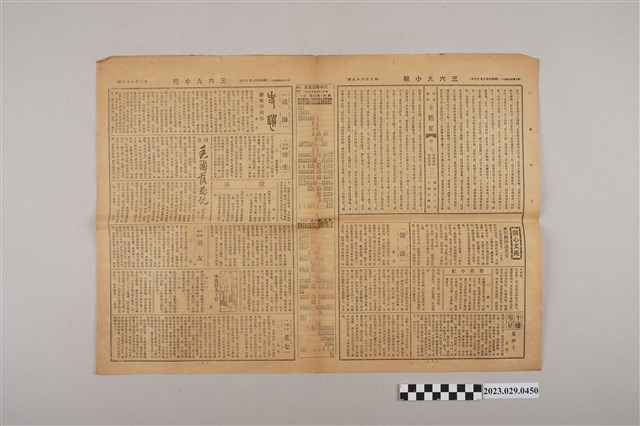 1.本物件為三六九小報社發行《三六九小報》第三百六十八期,發行人為趙雅福,本報正面為廣告頁,有永茂商行、蘭計圖書部、崇文堂書店等商家廣告;背面有雜爼專欄「關於神的研究」、「新聲律啓蒙」等文章;翻開內頁有滑稽短篇「獃生」,社會短篇「朋友」等文章。2.《三六九小報》發行時間自昭和5年(1930)至昭和10年(1935),旨以刊登戲謔、針砭時事之文,反映當時的社會狀況。