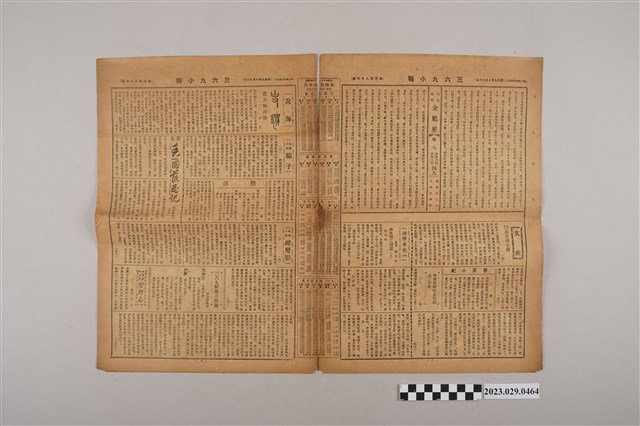 1.本物件為三六九小報社發行《三六九小報》第三百八十六號,發行人為趙雅福,正面有應元痲病丸、王外科醫院、蘭記圖書部、天國咖啡店等7個廣告;背面為雜爼專欄「靜室小言」、「話柄」、「新聲律啟蒙」、「綠波山房摭談」、「三槎浦櫂歌(一)」、「破涕錄」、「迎秋小唱」、「詩壇」、「花界專電」等內容;翻開內頁有明史說部「金魁星」、文苑專欄「易實甫小傳」、謎學全史專欄(四二)「南北朝之謎話(九)」、「餐霞小紀」、「中國舊時代文學觀念之剖析(二)」等文章,說海專欄有「武術餘聞(一)」、短篇滑稽「騙子(四)」、「餘沫」、續篇