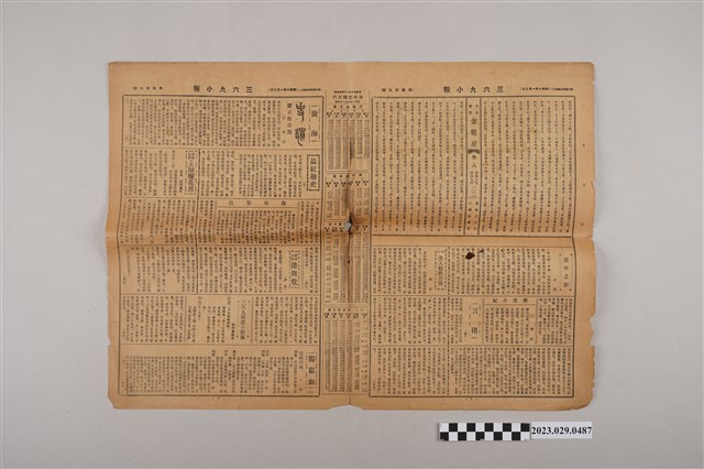 1.本物件為三六九小報社發行《三六九小報》第四百九號,正面為廣告,有泰安合資會社、崇文堂書店、六和商店、王外科醫院、天國咖啡店等單位;背面寫有雜爼專欄「醉廬漫筆」、「綠波山房摭談」、「謎學全史(四八)」、「話柄」、「一笑集」、「墨餘」等文章,左下有花叢小記;翻開內頁有「金魁星」、「迎年之辭」、「言豬」、「美人般的春節」、「品紅趣史」、長篇社會小說「蜃樓花月」、破迷小說「迷與覺」、「獨幕劇」等文章及海外零訊。2.《三六九小報》發行時間自昭和5年(1930)至昭和10年(1935),旨以刊登戲謔、針砭時事之