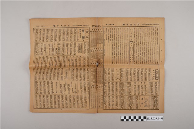 1.本物件為三六九小報社發行《三六九小報》第四百十三號,發行人為趙雅福,正面有泰安合資會社、崇文堂書店、天國咖啡店等7個廣告;背面文章為雜爼專欄「綠波山房摭談」、「紙鳶雜話」、「曼殊逸事」等內容;翻開內頁有明史說部「金魁星」、開心文苑專欄「游春辭(續)」、「墨餘」、說海專欄有長篇小說「海國變遷」、破迷小說「迷與覺」等文章。2.《三六九小報》發行時間自昭和5年(1930)至昭和10年(1935),旨以刊登戲謔、針砭時事之文,反映當時的社會狀況。