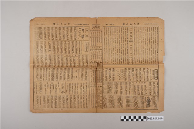 1.本物件為三六九小報社發行《三六九小報》第四百十六號,發行人為趙雅福,正面有泰安合資會社、六和商店、和光醫院等7個廣告;背面文章為雜爼專欄「水庵閒話」、「新聲律啟蒙」、「記靈禽」等內容;翻開內頁有明史說部「金魁星」、開心文苑專欄「送諸神上天序」、「餐霞小紀」、說海專欄有連載小說「奇婦報仇」、「花鞋李四」等文章。2.《三六九小報》發行時間自昭和5年(1930)至昭和10年(1935),旨以刊登戲謔、針砭時事之文,反映當時的社會狀況。