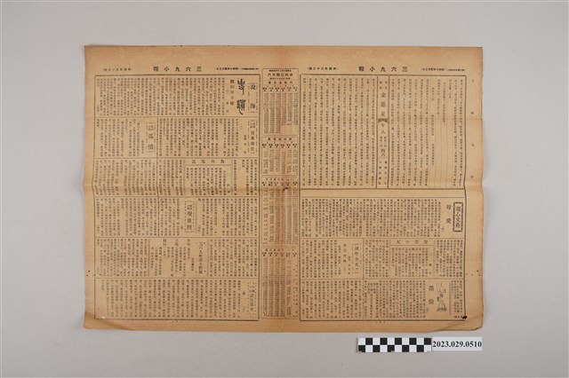 1.本物件為三六九小報社發行《三六九小報》第四百三十三號,發行人為趙雅福,正面有王外科醫院、六和商店、和光醫院等7個廣告;背面文章為雜爼專欄「神醫絕技」、「六足牛考」、「詞林」等內容;翻開內頁有明史說部「金魁星」、開心文苑專欄「母愛」、「餐霞小紀」、說海專欄有連載小說「和坤弄權」、紀念小說「孤憤」等文章。2.《三六九小報》發行時間自昭和5年(1930)至昭和10年(1935),旨以刊登戲謔、針砭時事之文,反映當時的社會狀況。