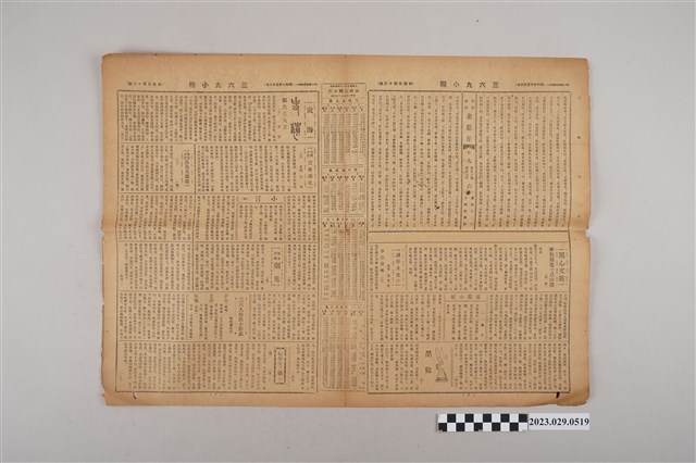 1.本物件為三六九小報社發行《三六九小報》第四百四十三號,發行人為趙雅福,正面有泰安合資會社、六和商店、和光醫院等6個廣告;背面文章為雜爼專欄「荒唐齋小話」、「黑暗世界可以無慮」、藝苑消息「南山生壙徵詩」等內容;翻開內頁有明史說部「金魁星」、開心文苑專欄「勸鍾進士出山書」、「墨餘」、說海專欄有連載小說「魚壳大王」、短篇諧聞「烟鬼」等文章。2.《三六九小報》發行時間自昭和5年(1930)至昭和10年(1935),旨以刊登戲謔、針砭時事之文,反映當時的社會狀況。