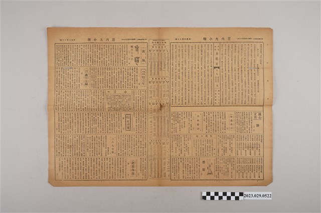 1.本物件為三六九小報社發行《三六九小報》第四百四十六號,發行人為趙雅福,正面有泰安合資會社、六和商店、和光醫院等6個廣告;背面文章為雜爼專欄「荒唐齋小話」、「三煞闢謬」、「花叢小記」等內容;翻開內頁有明史說部「金魁星」、開心文苑專欄「動」、「射虎拾碎」、說海專欄有連載小說「魚壳大王」、短篇小說「義婢延嗣」等文章。2.《三六九小報》發行時間自昭和5年(1930)至昭和10年(1935),旨以刊登戲謔、針砭時事之文,反映當時的社會狀況。