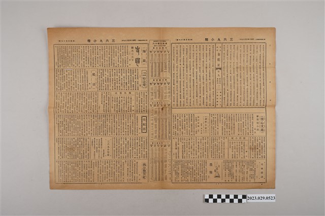 1.本物件為三六九小報社發行《三六九小報》第四百四十七號,發行人為趙雅福,正面有泰安合資會社、六和商店、和光醫院等6個廣告;背面文章為雜爼專欄「靜室小言」、「義捐演劇小評」、「花叢小記」等內容;翻開內頁有明史說部「金魁星」、開心文苑專欄「雞母小傳」、「玦林燈謎」、說海專欄有連載小說「魚壳大王」、「愛貓」等文章。2.《三六九小報》發行時間自昭和5年(1930)至昭和10年(1935),旨以刊登戲謔、針砭時事之文,反映當時的社會狀況。