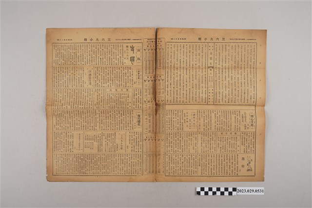 1.本物件為三六九小報社發行《三六九小報》第四百五十八號,發行人為趙雅福,正面為廣告頁,有泰安合資會社、和光醫院、王外科醫院、六和商店、蘭記書局等廣告;背面雜爼專欄則有「渾淘タ談齋叢」、「座右銘」等文章;翻開內頁有說海專欄「魚壳大王」、滑稽小說「酒徒自述」等文章。2.《三六九小報》發行時間自昭和5年(1930)至昭和10年(1935),旨以刊登戲謔、針砭時事之文,反映當時的社會狀況。