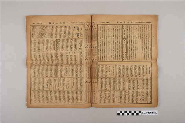1.本物件為三六九小報社發行《三六九小報》第四百五十九號,發行人為趙雅福,正面為廣告頁,有泰安合資會社、和光醫院、王外科醫院、六和商店、蘭記書局等廣告;背面雜爼專欄則有「靜室小言」、「喫菸室」等文章;翻開內頁有說海專欄「魚壳大王」、滑稽小說「酒徒自述」等文章。2.《三六九小報》發行時間自昭和5年(1930)至昭和10年(1935),旨以刊登戲謔、針砭時事之文,反映當時的社會狀況。