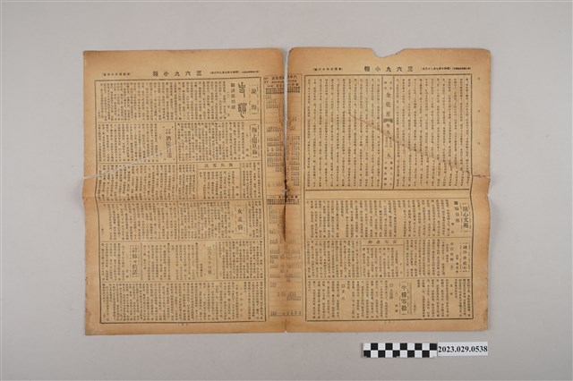 1.本物件為三六九小報社發行《三六九小報》第四百六十六號,發行人為趙雅福,正面為廣告頁,有泰安合資會社、和光醫院、王外科醫院、六和商店、蘭記書局等廣告;背面雜爼專欄則有「靜室小言」、「不可思議之靈子術」等文章;翻開內頁有說海專欄「談張鵬翮」、滑稽小說「酒徒自述」等文章。2.《三六九小報》發行時間自昭和5年(1930)至昭和10年(1935),旨以刊登戲謔、針砭時事之文,反映當時的社會狀況。