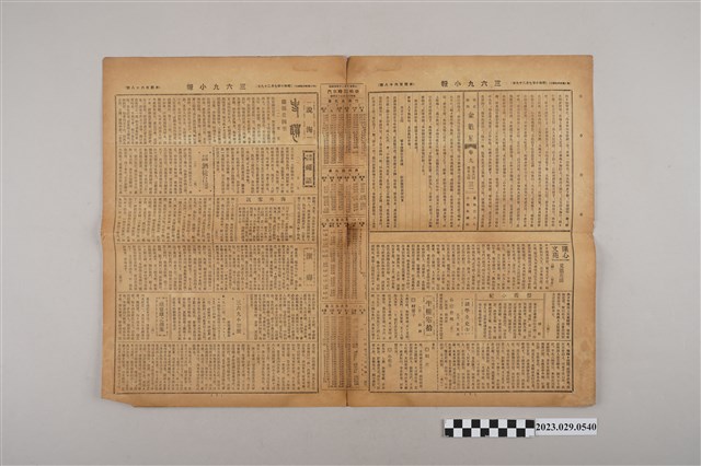 1.本物件為三六九小報社發行《三六九小報》第四百六十八號,發行人為趙雅福,正面為廣告頁,有泰安合資會社、和光醫院、王外科醫院、六和商店、蘭記書局等廣告;背面雜爼專欄則有「靜室小言」、「不敢公然致送之挽聯」等文章;翻開內頁有說海專欄「福竟四至」、滑稽小說「酒徒自述」等文章。2.《三六九小報》發行時間自昭和5年(1930)至昭和10年(1935),旨以刊登戲謔、針砭時事之文,反映當時的社會狀況。