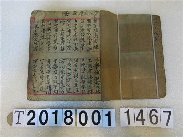 封面遺失,首頁寫有「苦工寫成、吳阿俊自抄書、廿三工廠歌、改勸諸君好子歌、閻王判好呆歌、壹百草名歌、奮勵努力歌、教育勸改歌、共娘包食穿歌、勸人知足歌、查埔去乎查某送笑料歌、拾殿地獄刑具歌、雪文思君歌、臺北更生院改煙歌、八仙歌」