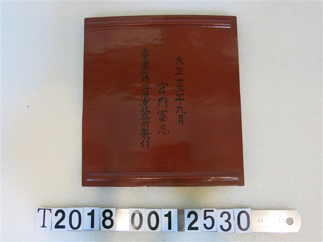 1.本物件為臺東岩灣浮浪者收容所製漆器置物方盒。材質為木製漆器,共四層,每層蓋上有一個「宮」字標記,底部寫著「大正十三年九月宮內富志臺東岩灣浮浪者收容所製作。2.1902年起,臺灣總督府為確保臺灣治安的穩定性,而對浮浪者採取規劃措施。所謂浮浪者,即是清朝以來的羅漢腳,1906 年,臺灣總督府公布「臺灣浮浪者取締規則」,警察對於沒有固定居所、沒有固定職業、會有妨害治安之嫌,經戒告下仍未改正者,得在總督的許可下,可送往臺東加路蘭的「浮浪者取締收容所」。其後,又於火燒島(今綠島)設立「火燒島浮浪者收容所」,以舍獄方式進行管理,並強制期勞動,以培養謀生能力。1920年,總督府以告示第26號,公布自3月1日起廢除火燒島浮浪者收容所,所收浮浪者移入臺東岩灣浮浪者收容所。