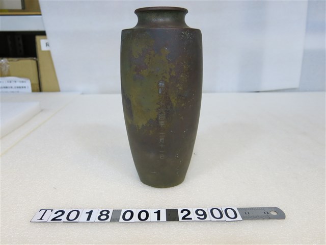1.本物件為皇紀兩千六百年二月二十一日表彰臺南州紀念花瓶。為金屬製材質,長條形,瓶身中間寫著「表彰」,被兩隻瑞獸包圍著。另一邊寫著「皇紀兩千六百年二月二十一日」,瓶身靠近瓶底處寫著「喬峰」。2.為激發國民的愛國心,1940年日本政府舉辦「皇紀二千六百年」紀念活動。皇紀二千六百年亦為神武天皇即位紀元,又稱日本皇紀或簡稱皇紀,以日本神話中的第一代天皇神武天皇的即位元年開始起算。日本政府相當重視皇紀二千六百年,對日本內地而言是個重要的日子,不論是日本本土或是殖民地皆有慶祝活動,除了有專屬的歌曲外,也發行各類的繪葉書(按:明信片)、專書、郵票、紀念品等。