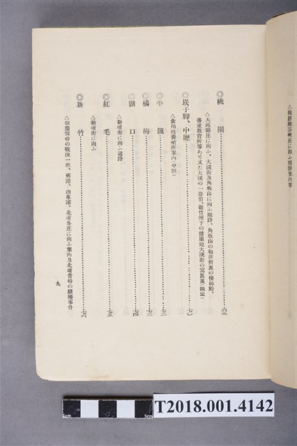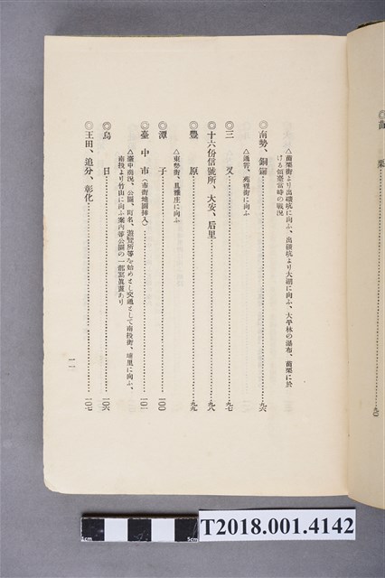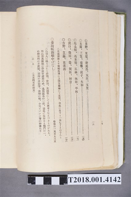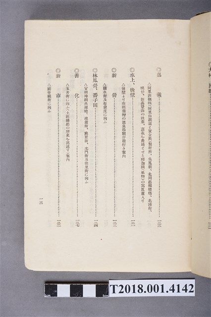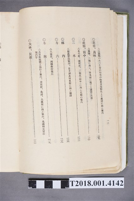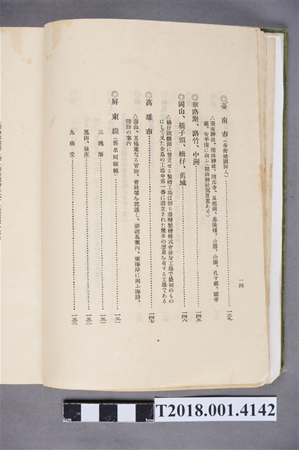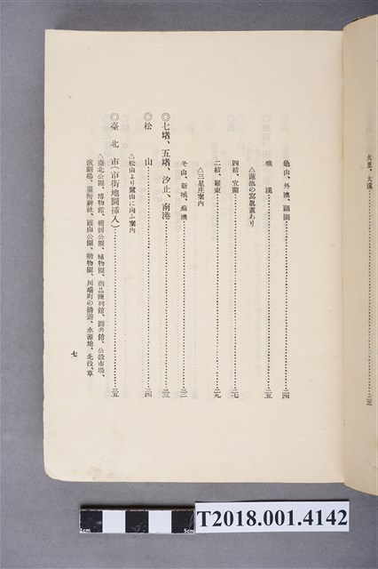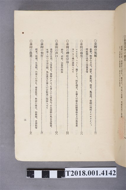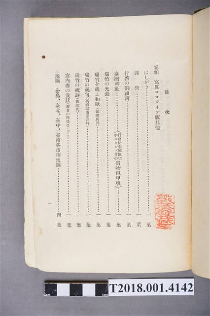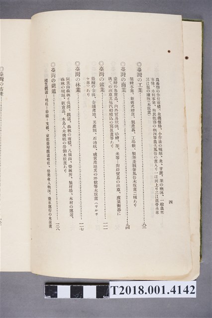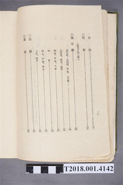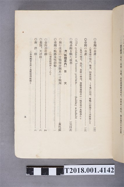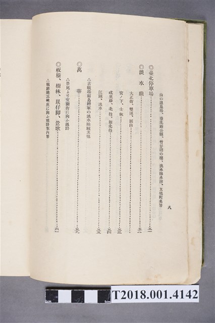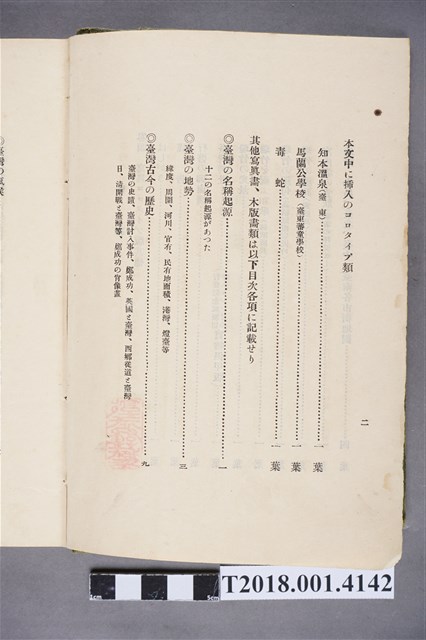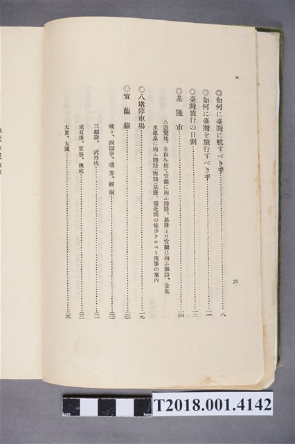 1.本物件為水谷德次郎編著的《臺灣》書籍。以綠色外殼裝訂,外殼無封面設計。內頁封面中央繪製紋面原住民女子側臉圖,圖書印「FORMOSA」,右上角印「WITH TAIWAN TRAVALGUIDE」;圖案下方由右而左印《臺灣》書名,書名下方橫印「附 台湾旅行地理案內」字樣。正文之前有序文、目次及行啟儀仗、臺灣神社、屏東瑞竹圖片。正文主要分門別類介紹臺灣的名稱起源、地勢、歷史、氣候、衛生、神社宗教、戶口、教育、農業、工業、商業、礦業、林業、鐵道、畜產及水產等,每個項目後附有若干張木版畫。後半部為「地理案內」附錄,收錄從島外往臺灣旅行的資訊及注意事項,接著以宜蘭線、縱貫線、屏東線等3條鐵道路線為主,由北而南介紹沿線車站及其附近景點與旅遊指南。最末是版權頁,編著、印刷、發行等相關資訊。