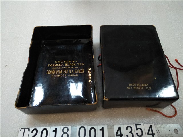 1.本物件為臺灣紅茶漆器盒。為黑色的長方形盒子,正面有富士山和五重塔及寺廟圖案,蓋子裡寫著CHOICEST,FORMOSA BLACK TEA,GROWN IN MITSUI TEA GARDEN 字樣(按:優選臺灣紅茶,種植於三井茶園)。 背面則寫著MADE IN JAPAN及NET WEIGHT 1LB(按:日本製造,淨重1磅)。2.日本領臺之初,臺灣總督府極重視臺灣茶業的發展,對臺北、新竹等主要產茶地區進行茶業調查,並推動臺灣茶業改革。從茶園經營管理的改良、茶業人才的養成、茶業的輔導獎勵、優良茶樹的選種、茶樹栽培與茶葉摘採方法的改良、機械製茶的試驗與推廣、茶業產銷組織的成立、茶葉交易的簡化與合理化、茶葉品管機制的建立、國際茶市場的拓展、茶葉行銷的廣告宣傳,以及臺灣紅茶的發展等。在茶業現代化發展的過程中,除了官方扮演主要的推手之外,民間運用自身的力量投入茶業之改良亦頗有成就,1918年總督府推行茶業獎勵計畫、鼓勵茶農組織茶業組合之,臺北州與新竹州茶產地紛紛成立茶業組合或茶業公司,並進一步組織茶業公司聯合會或茶業研究會,以集體的力量協調地區茶葉之產製,並舉辦各項活動推動茶業改良的工作。3.日治時期,日本當局致力於茶業近代化,許多日本資本投資臺灣茶業。其中,三井物產成立於1876年,隸屬於三井財團,總部設在日本東京日本橋,早在日治初期即涉足臺灣的製糖、樟腦等產業;1909年,三井合名會社(簡稱三井合名)成立,大肆來臺收購茶園及設立製茶廠,至1920、30年代形成由三井合名製茶,三井物產包裝、外銷的情況。三井最初是以烏龍茶銷售為主,1927年以「三井紅茶」為名販售紅茶;1933年,三井創立「日東紅茶」品牌,成為會社紅茶的專屬品牌。