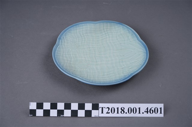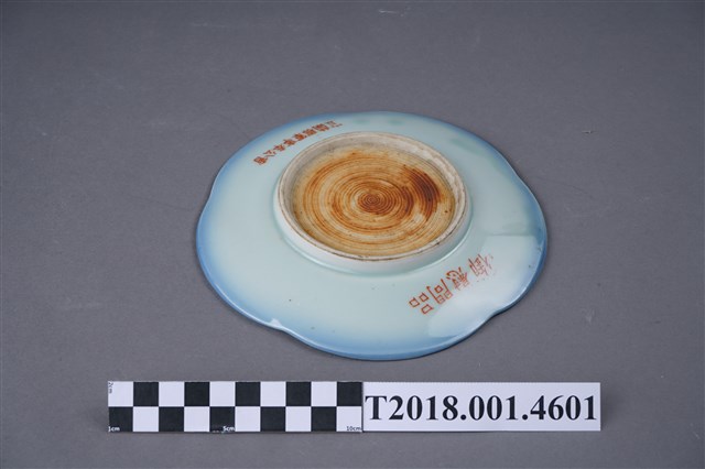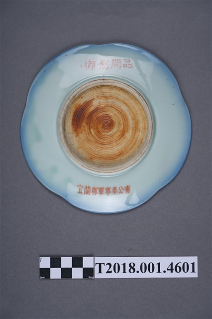 本物件為陶製宜蘭郡軍事奉公會御慰問品紀念盤。為陶製品,盤面為花瓣型,底色為白色,兩旁有藍邊。底部上方寫著「御慰用品」,下方寫著「宜蘭郡軍事奉公會」。