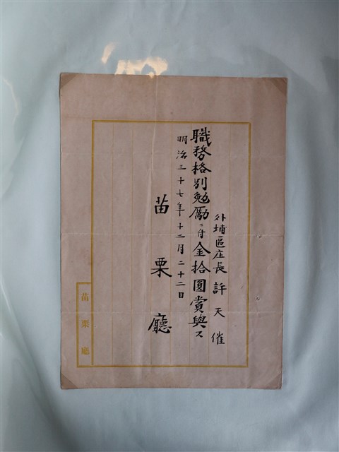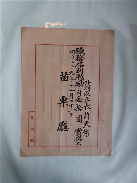 苗栗廳獎賞外埔區庄長許天催
