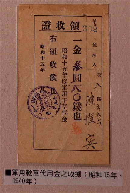 戰時要求農民繳納軍用乾草之通知書與收據與軍用乾草代用金收據