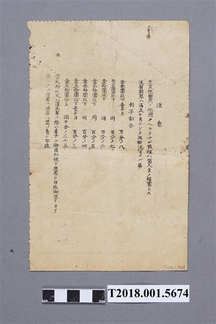 本物件是淡水基合發質屋號給陳水泉的收據。說明抵押時間為大正十三年六月十一日到十一月十日。抵押者為陳水泉。左邊為利息的計算方式和抵押的注意事項。