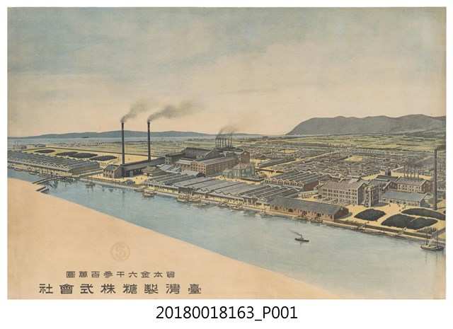 1.本物件是臺灣製糖株式會社海報。糖廠為後壁林製糖所。近景為運河,中間為糖廠建築,遠景可見壽山和海。左下角有臺灣製糖資本額資訊。2.1895年日本統治臺灣,致力於糖業改革。在總督府對日本資本的勸誘下,1900年臺灣製糖株式會社在東京成立,以三井財閥旗下的三井物產會社為最大股東,並選定在今高雄橋頭設立新式製糖場;1902年,橋頭製糖場完工運作,為臺灣第1間新式製糖場,也是前期臺灣製糖本社所在地(1922年本社遷往屏東);臺灣製糖在日治中、前期長期為臺灣最大的製糖會社。後壁林工場是林少貓抗日勢力被消滅後,由臺灣製糖取得其佔據的土地,闢建成農場及糖廠,1907年12月糖廠完工,次年1月開始製糖。