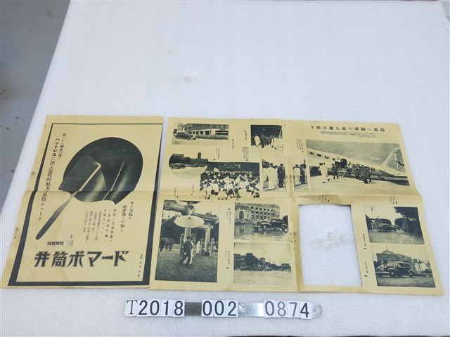 1.本件為全島模型飛行機競技大會宣傳單,共有三張,左邊張寫著「航空愛國週間協會 全島模型飛行機競技大會」,並有大會的照片5張;中間張有照片4張,為臺灣地方風景照;右邊張有照片6張,為舉辦競技大賽之後,頒發優勝獎賞之情形。2.1937年中日戰爭爆發前後,日本為了朝向「控制天空等於控制世界」的目標邁進,在日本國內興起「愛國航空債卷」與「愛國航空彩票」的議論,更將青年學生視為重點培育對象。臺灣方面,自1934年開始,各學校成立航空研究社團與活動,也為了讓學生能展示成果與普及航空知識,1937年6月1日至6日間,由「臺灣國防義會航空部」與「帝國飛行協會臺灣地方聯合本部」共同舉辦與日本同步之「愛國航空週」;而臺灣日日新報為響應「愛國航空週」活動, 於1937年6月6日舉辦了「第一回全台灣模型飛行機競技大會」。