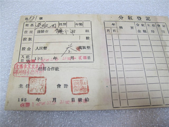 無棣縣第七區信用合作社社員證與黃敬周沈陽市蘇家屯區渾河鋪?信用社社員股金證