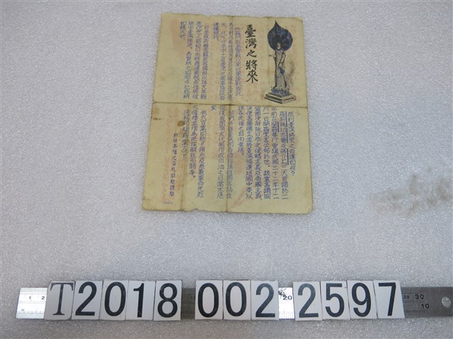 1.本物件為論「臺灣之將來」開羅宣言文宣,一面文宣右上方畫有1個紅色臺灣圖行,上面並寫有「臺灣の將來」,並以紅色日文字體寫下會戰以來日本政府節節敗退,提到羅斯福、邱吉爾與蔣介石三巨頭所發表的「開羅宣言」新聞公報中關於臺灣未來,另一面則以藍色中文寫出同樣內容,並署名前住高雄之海外同胞僅起,整個物件因為保存關係有明顯的泛黃與斑駁痕跡。