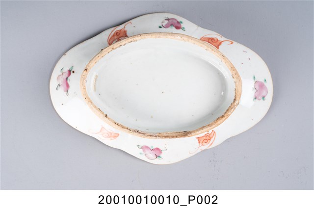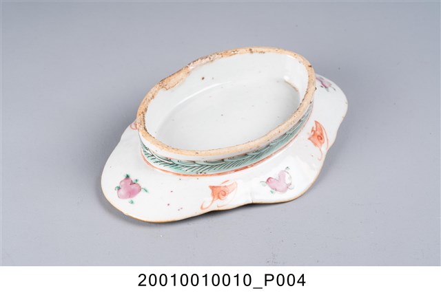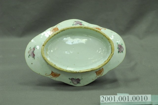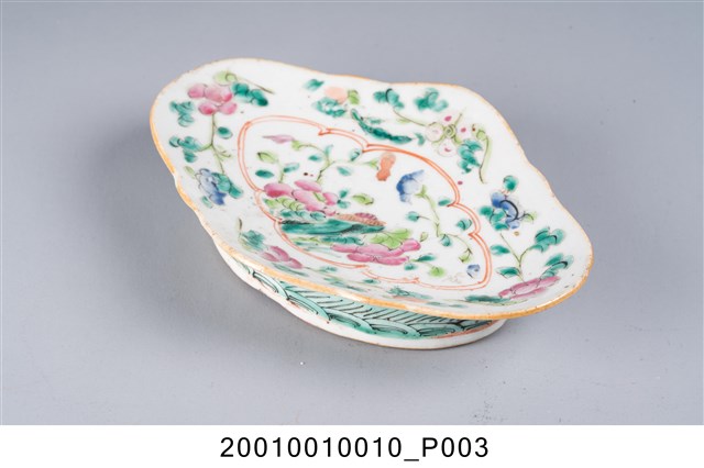 1.手繪釉上彩花卉紋菱形高足盤薄圓唇,淺腹,弧壁下收至圈足,直壁高圈足,圈足徑大,圈足底露胎,胎色偏黃,胎質細緻。全器以釉上彩繪裝飾,紋飾滿佈器內、外壁以及圈足外壁,用色多變粉嫩,洋溢生命氣息。口沿施罩一圈淺褐色釉,內壁中央以胭脂紅釉繪一雲形開光,開光內繪一截粗木與其上盛開的各式花朵;開光周圍則繪四組花草。紋飾以黑色色料描繪輪廓,再加以填彩。以粉紅、綠釉為主要色調,綴以藍、淺橘等顏色,使得整體色調和諧清新,並以開光的方式凸顯紋飾的主從關係。器外壁則以胭脂紅釉、淺紫色釉簡單地交替繪兩種花朵裝飾;圈足壁以黑色