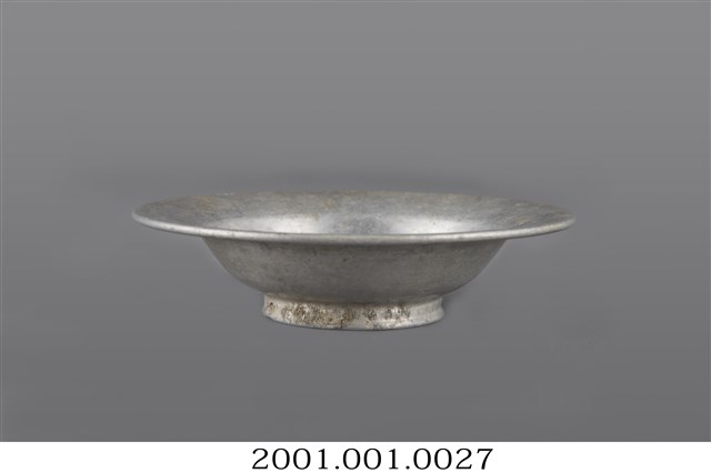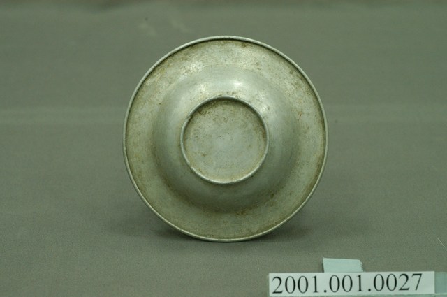 1.鋁製寬折沿碗圓唇,寬折沿,淺圓腹,斜壁下斂至圈足,矮圈足。全器素面無紋,是由模具將鋁金屬壓製成形。唇部外捲呈圓唇貌,避免銳利的金屬邊緣不好就口。由碗心可見壓印痕跡,為向下壓出圈足壁的印痕。2.臺灣開始製作鋁製生活用品是在日據時期,日本財團於1935年在高雄成立了日本鋁業株式會社,才開始了臺灣鋁工業。日鋁至臺鋁時代所產的鋁製品種類眾多,從日用品至飛機部件皆有,是臺灣工業化的重地之一。