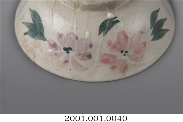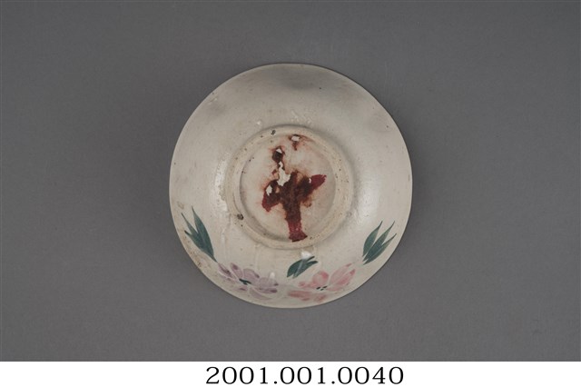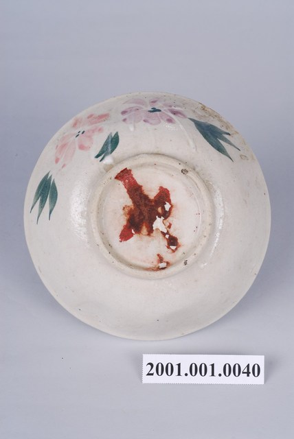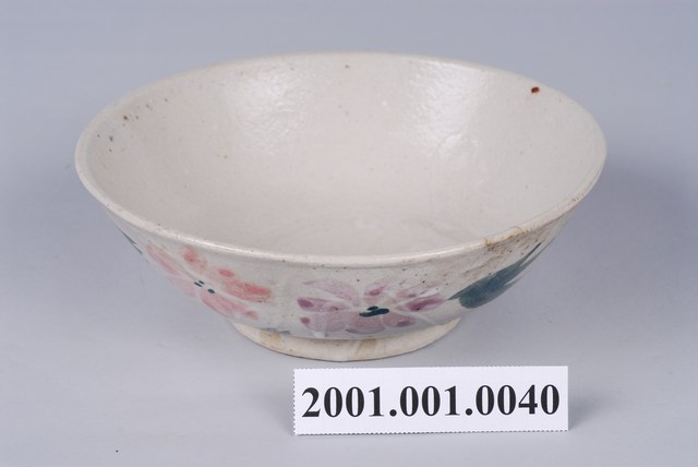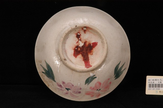手繪粉紅釉花卉紋碗屬高溫燒造,並且以模具塑形的作品。圓唇,敞口,弧壁下收,圓腹,碗底略作方折,碗底較深且寬,圈足徑稍大,圈足露胎,胎色米白,胎質略粗。全器施白釉,呈色微微帶米色調,釉色較暖,釉面光潔,器表略有氣孔。碗內壁素面無紋,內壁多有氣孔以及氣泡,因此釉面較不平整。碗外壁則因燒製溫度過高,導致釉面起伏,有非常明顯的流釉痕跡,且紋飾的顏色顯得過淡。模具成形,使得碗外壁略可見起伏變化,微微做出花瓣般的效果。主要紋飾繪於碗外壁的一側,以粉紅及淺紫色釉描繪花卉,花朵的形狀略小,並利用釉色堆疊做出深淺變化,形塑出花瓣的立體度,並以黛綠釉增添枝葉,整體釉色呈色較淡。構圖簡單大方,筆法優雅,風格雅緻。圈足底以紅色釉料做標記,應是作為窯口的辨認所用。