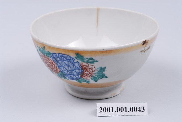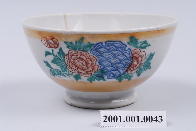 1.印花彩釉花卉紋碗為高溫燒製的瓷器。圓唇,平口,圓腹,弧壁下斂至圈足,圈足較高,足徑略小,圈足底緣寬於上部,略呈外撇狀,圈足底刮釉露胎,胎較薄,胎色潔白,胎質細緻。全器施白釉,釉色乳白濃厚,光華瑩潤。碗內壁潔白無添加紋飾,有細小的氣孔,接近口緣處有一龜裂痕跡,外壁也可見。所有紋飾主要繪在外壁,並以轉印的方式製成。外壁上端以及圈足周圍以淺黃褐色釉做略粗的帶狀裝飾,以此規範紋樣範圍,並在之中填入花朵結組而成的紋飾:以丹紅色的薔薇花與鮮綠色的葉片,圍繞著一鈷藍釉、帶有日式紋樣的波浪紋圓盤成一組,外壁兩側各繪一組紋飾。圈足底帶有一紅釉壓印,大半脫落,用意不明,可能是作為窯廠出產的辨識功能。2.轉印技術在臺灣盛行後,也提供瓷器大量生產的可能。轉印也有許多種方式,有橡皮蓋章般的轉印功能,或是以紙張做出來的模型作壓印,或是滾輪的方式等。轉印紋飾之間的距離,也可以判斷出做工細緻與否。印花是臺灣窯口生產瓷器十分重要的技術之一。