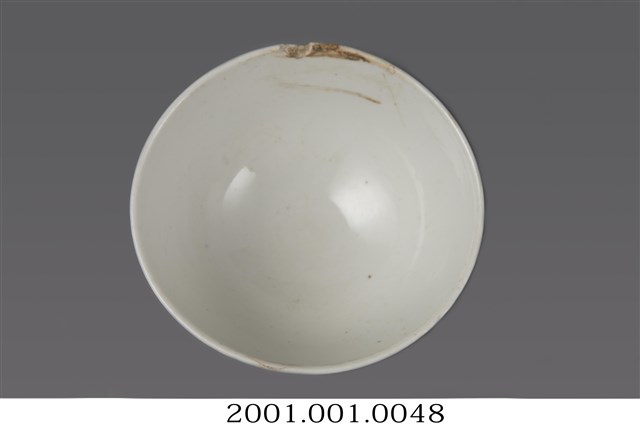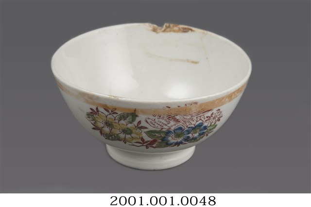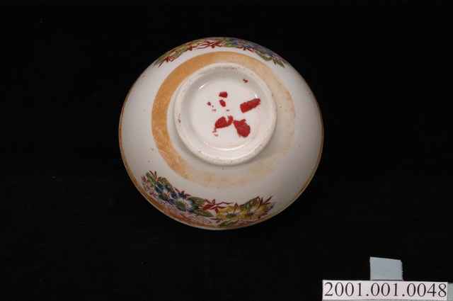 印花彩釉花鳥紋碗為高溫燒製的瓷器。圓唇,平口,圓腹,弧壁下斂至圈足,圈足較高,足徑略小,圈足底緣寬於上部,略呈外撇狀,圈足底刮釉露胎,胎較薄,胎色潔白,胎質細緻。全器施白釉,釉色乳白濃厚,光華瑩潤。碗內壁潔白無添加紋飾,有細小的氣孔,口緣處則有一破損痕跡。所有紋飾主要繪在外壁,並以轉印的方式製成。外壁上端以及圈足周圍以淺黃褐色釉做略粗的帶狀裝飾,以此規範紋樣範圍,並在之中填入花朵結組而成的紋飾:以丹紅色描繪紋飾的輪廓:如牽牛花、花苞與陪襯的葉片等,再填入各種彩釉,作成一組花團錦簇的飽滿紋飾,並在花卉紋的上方繪一開展翅膀的鳥紋。碗外壁兩側各繪一組相同的紋飾。圈足底帶有一紅釉壓印,大半脫落,用意不明,可能是作為窯廠出產的辨識功能。