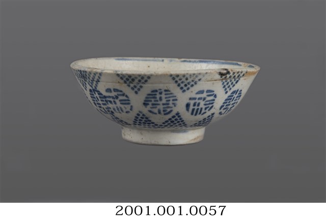 1.青花印花「福壽」字紋碗平唇,侈口,圓腹,斜壁下斂至圈足,圈足底部露胎,胎色帶灰且偏黃,胎質較粗糙且有些許較大的顆粒,厚胎。全器施白釉,呈色透白。器表以鈷藍釉裝飾,青花發色較淡且不均。內壁在口沿及靠近碗心兩處各繪一弦紋裝飾,部分釉已磨損,導致線條並不連貫。紋飾集中於外壁,近口沿與圈足處以藍色小圓點排列成三角形,繪製一圈裝飾帶,三角裝飾之間繪圓形的紋樣,內部以粗短的線條排列出「福」、「壽」等吉祥紋樣。2.此件作品是日治時期北投窯十分流行的鶴紋碗樣式為基準演變而來的,使用的紋飾是民間十分普及的吉祥文字。紋樣皆以模板轉印而成,因此多可見模板沒有連接好或是相疊重複轉印的樣貌。