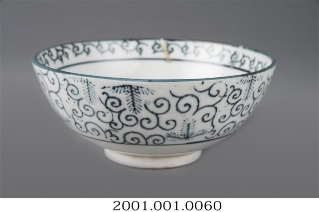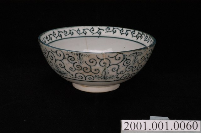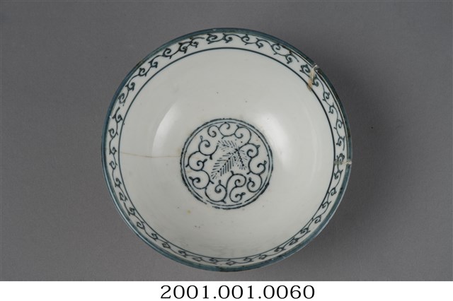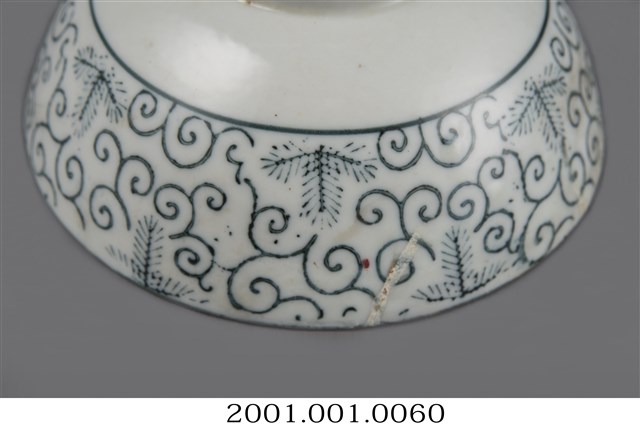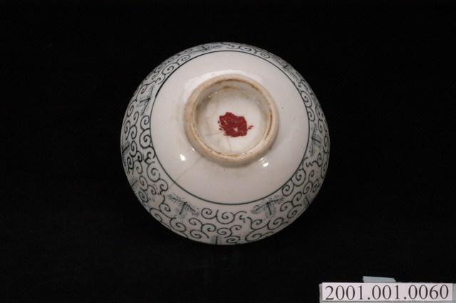 1.青花印花卷草紋碗平唇,直口,圓腹,斜壁下斂至圈足,圈足底部露胎,胎色偏黃,胎質細膩。全器施白釉,釉色瑩亮,呈色潔白。器表內、外壁以鈷藍釉裝飾,鈷藍釉發色較深且帶灰色調。內壁靠近口沿處繪一裝飾帶,內填頭尾相連的卷草紋樣,樣式單純。碗心以雙弦紋為圈,內繪卷草紋及葉紋,葉紋筆觸簡短有力。外壁以弦紋分隔出裝飾帶,主要集中於壁面上部,裝飾帶中重複與碗心相同結組的紋樣,呈現手法格式化但不僵硬,以線條為主,樣式典雅。2.此件作品碗心帶有一朱紅釉印製的落款,但釉料控制不佳,因此並不能清楚地判別,推測可能為大同瓷器早期的款識。