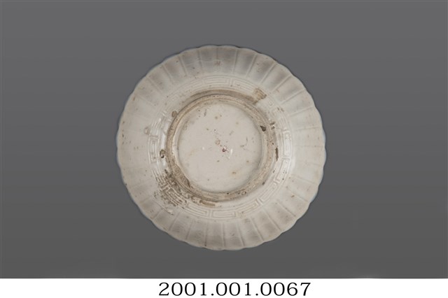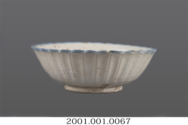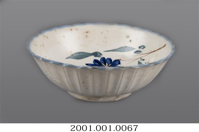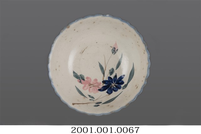 1.手繪胭脂紅釉花卉紋花口碗以模具成形,高溫燒製,敞口,弧壁,圓腹,碗底較淺且寬,圈足徑適中,圈足露胎,胎色米白偏黃,胎質略粗糙。全器施白釉,呈色略帶米色調,釉面光潔,器表略有氣孔與沈澱,尤其圈足周圍十分明顯。口沿作向外開展的波浪花口狀,口沿施罩一圈淺藍色釉,呈色深淺不均。碗外壁素面無紋,僅以模具印出片狀的長條形,外壁近圈足處則印有一橫向帶狀的雙回字紋,整件作品由外壁的模印效果看起來像是盛開的花朵造型。主要紋飾以碗內壁的圖案為主,以粉紅、鈷藍釉描繪大朵花卉以及一株小花苞,並以黛綠釉增添枝葉。構圖簡潔,筆法有力,線條優雅。2.花有富貴榮華的象徵意涵,因此是民間常見的裝飾紋樣。而胭脂紅釉與鈷藍釉是民間愛用的且常搭配的釉彩組合,經常與黛綠色釉搭配繪製紋樣,有相輔相成的效果。