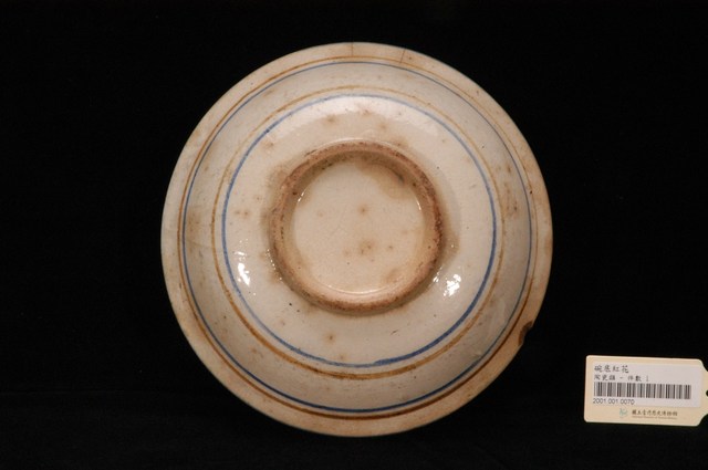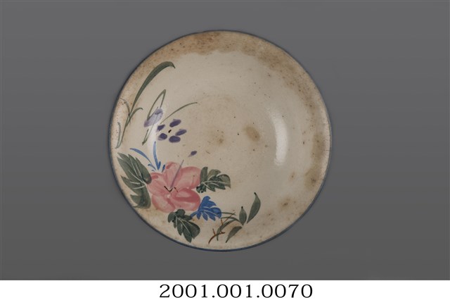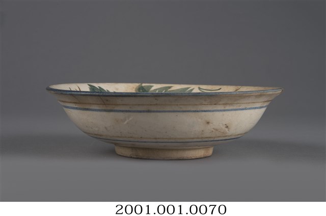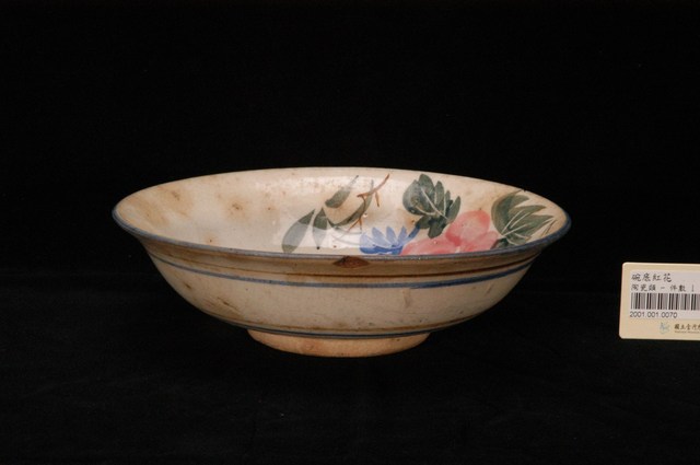 手繪花卉紋折沿碗為高溫燒造的器皿,敞口,弧壁,圓腹,碗底較淺且寬,圈足徑適中,圈足露胎,胎色偏黃,胎質略顯粗糙。全器施白釉,呈色為米色調,釉面光潔,器表略有氣孔以及許多雜質沈澱,器內壁的氣孔略大;碗外壁多處見龜裂痕跡,近口沿處更有破損痕跡。口沿處略作較窄的折沿造型,作開展狀。碗外壁裝飾簡單大方,以藍、黃兩色釉作兩兩成組的弦紋裝飾,口沿處亦施藍釉弦紋。主要紋飾集中於碗內,構圖偏向一側,以粉紅釉的花朵為主角,兩側以藍、綠兩色釉做枝葉陪襯,筆法寫意疏朗,活潑不失野趣。